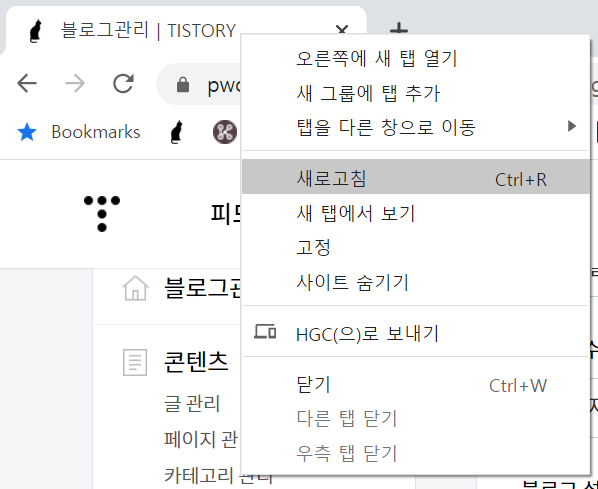 2. 생성된 탭에서 마우스 우측 버튼을 누르고 새로고침을 누른다.